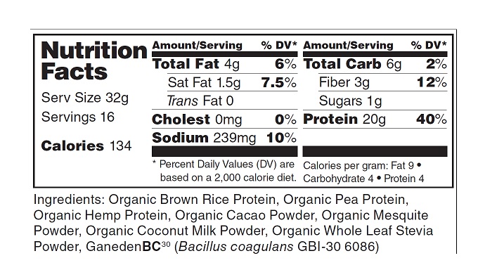 1. The Ingredients. 100% raw, organic, vegan, real food ingredients. No highly processed fillers, GMOs, “natural flavors,” artificial sweeteners, corn, soy, dairy, etc. 20 grams of clean, organic plant protein (brown rice, pea, and hemp). It’s the cleanest, healthiest protein powder you’ll find.