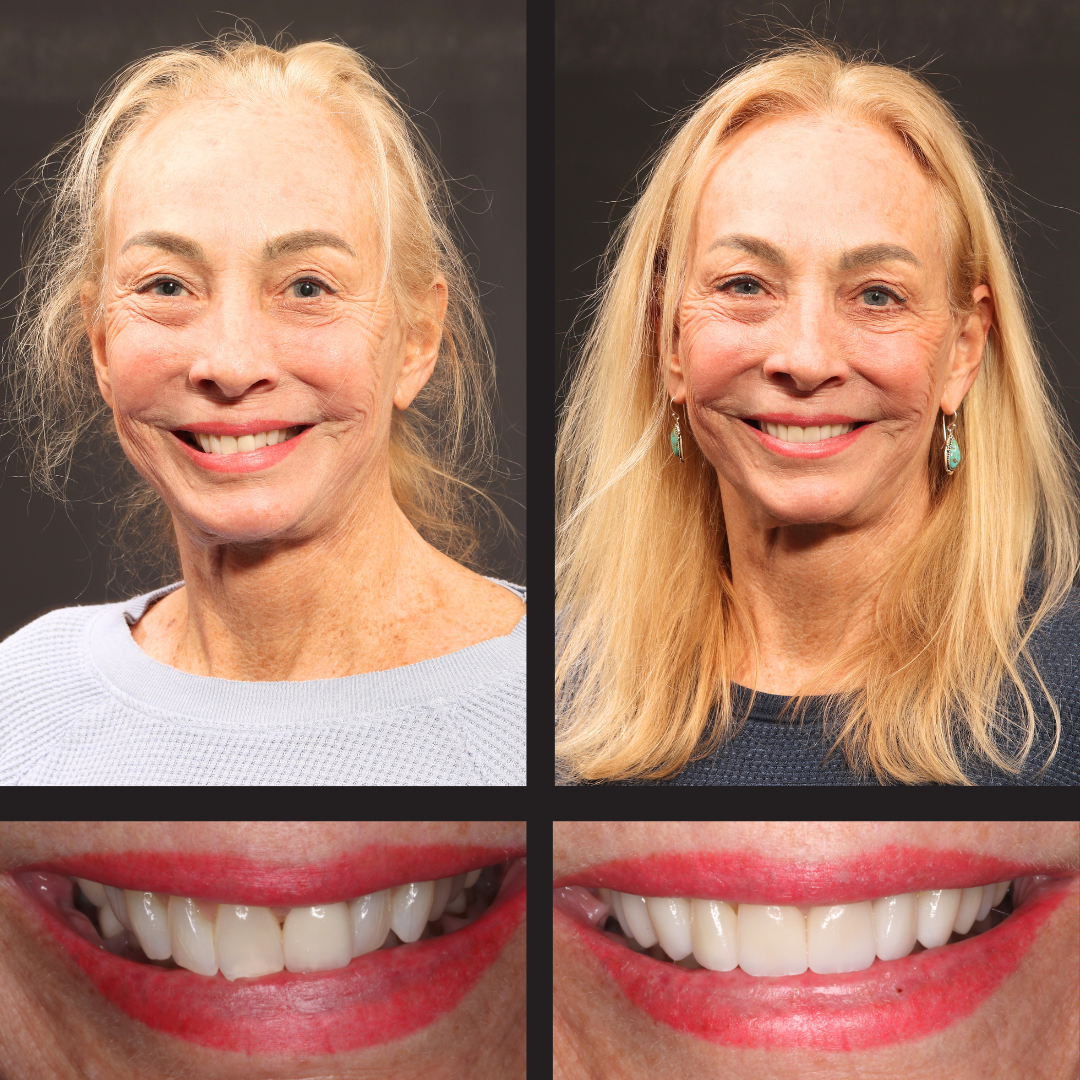 Fifteen years after getting veneers, Karen still loved her smile, but changes in her gums and other teeth raised concerns. We worked with her to identify the root cause of bone loss and receding gums, developing a custom plan to restore and preserve her smile for years to come.